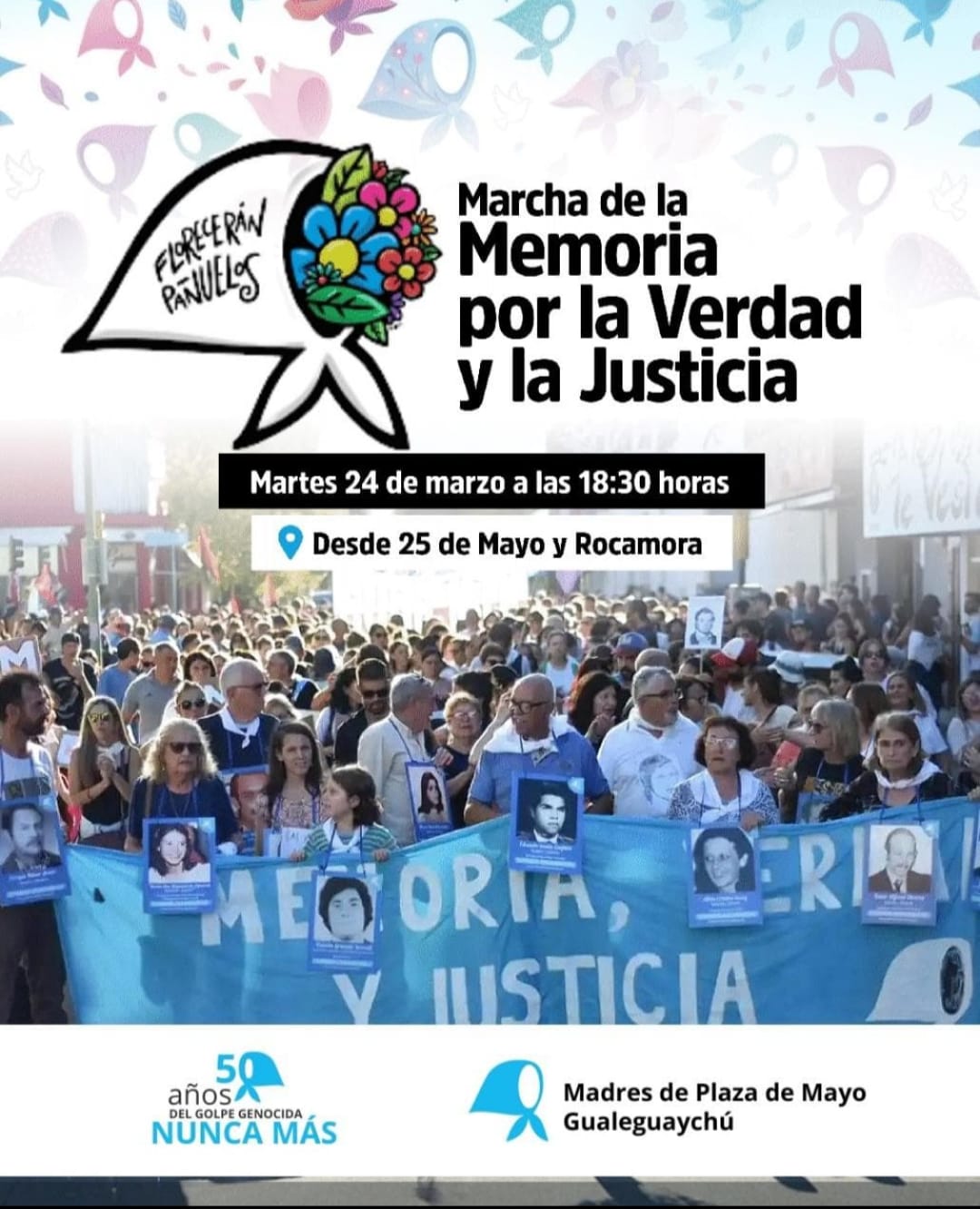 Desde Madres de Plaza de Mayo invitaron a todos a sumarse bajo la consigna «Florecerán Pañuelos. Por Memoria, Verdad y Justicia».